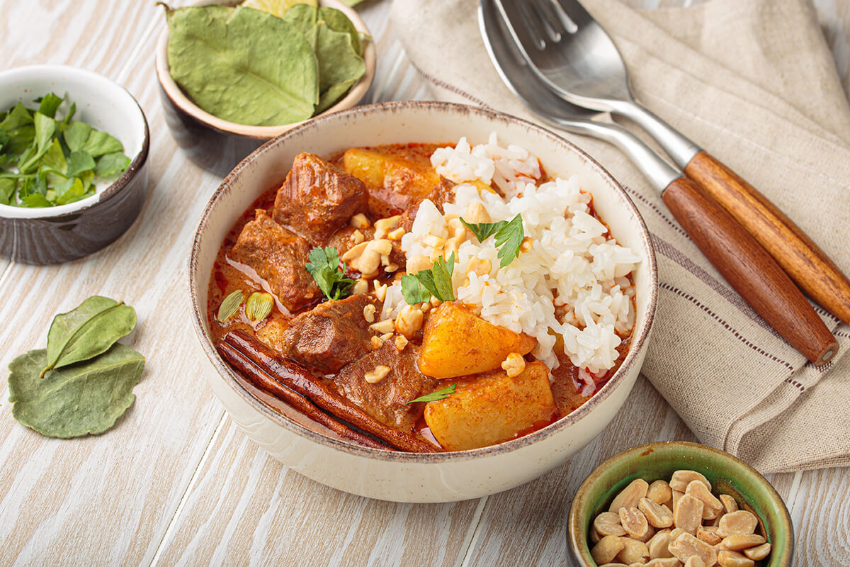 Indian influence is evident in the use of curry powders, coconut milk, and ingredients like turmeric, cardamom, and cumin. Dishes such as Massaman curry reflect Indian culinary traditions, combining spices, slow-cooked meats, and peanuts, which are believed to have been introduced through Indian traders.